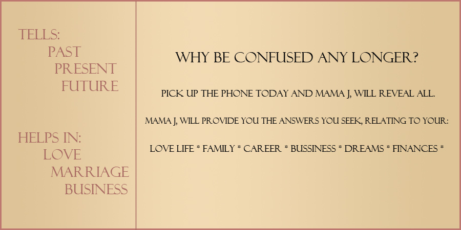 Mama J, will give you insight to have peace of mind, with your most deepest problems and situations that are occurring in your life.